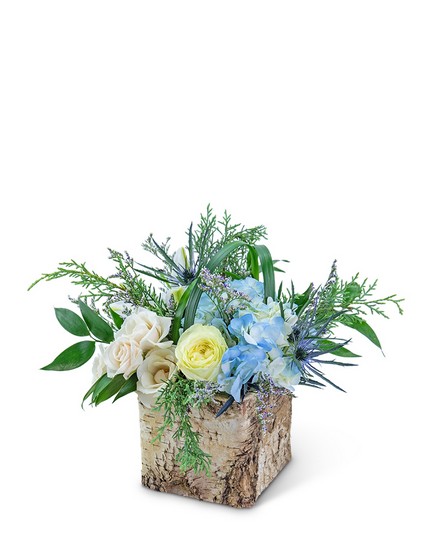 The soft blues and whites of a clear summer sky are captured in this bouquet. Celestial Sky features blue hydrangea, white roses, blue eryngium, lily grass, evergreen, limonium, and Italian ruscus in a charming birth box. This tranquil arrangement is perfect for a new baby, get well or just because gift.